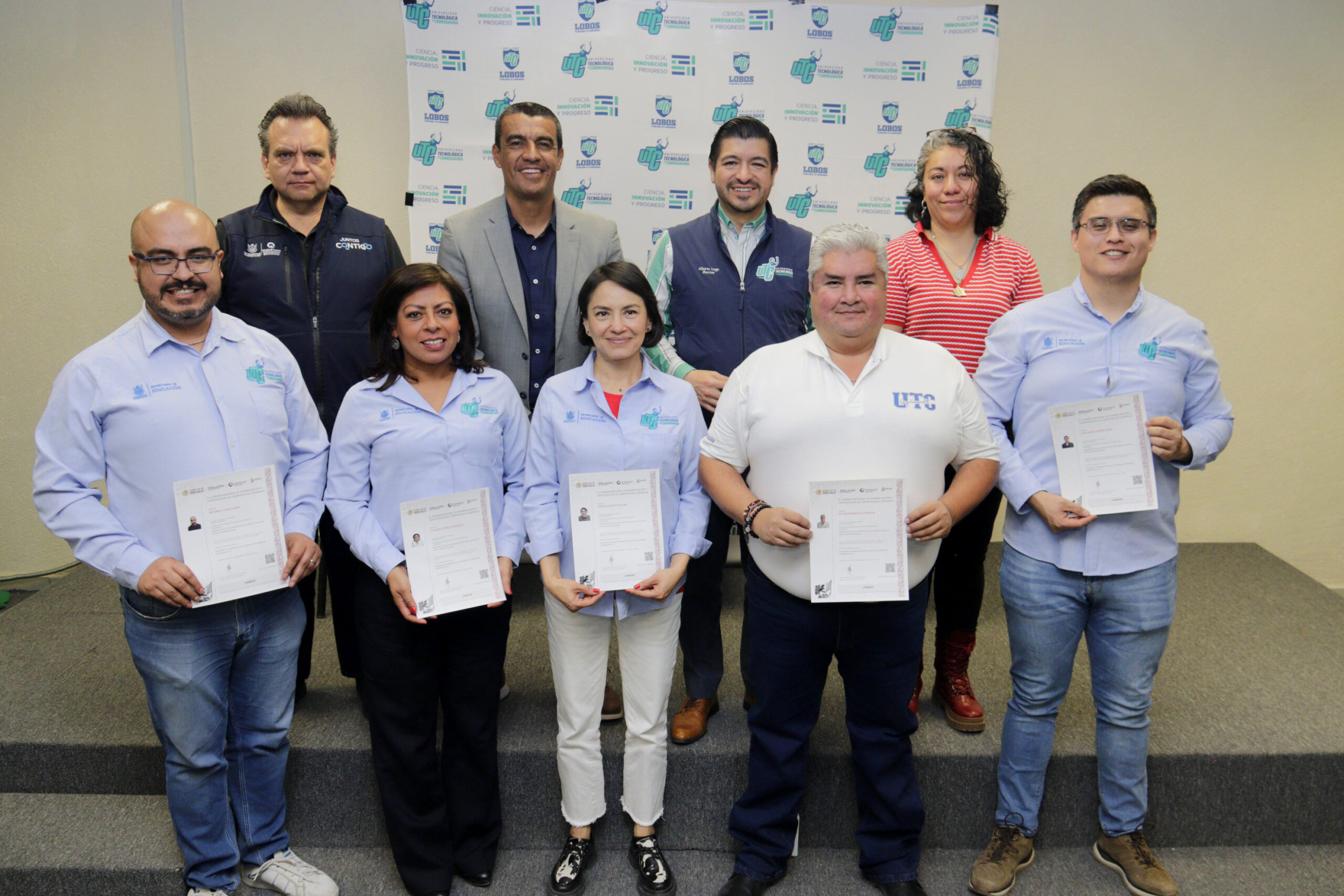 Personal docente y administrativo de la Universidad Tecnológica de Corregidora (UTC), recibió de manos del rector Alberto Lugo Ledesma, el Certificado de Competencia Laboral otorgado por el Consejo Nacional de Normalización y Certificación de Competencia Laboral (CONOCER), organismo responsable de operar el Sistema Nacional de Competencias, como resultado de la capacitación y evaluación en el estándar EC0217.01 “Impartición de Cursos de Formación de Capital Humano”.